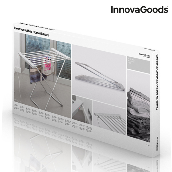 Det elektriska torkstället InnovaGoods Home Houseware (8 ribbor) har bara fördelar! En praktisk inomhus torkställning för snabbtorkning av all tvätt. Tar lite plats och är mycket enkel att använda. Perfekt under vinter, speciellt när det blir extra kallt, regnigt och fuktigt. Kan även användas som vanligt torkställ utan elanslutning.