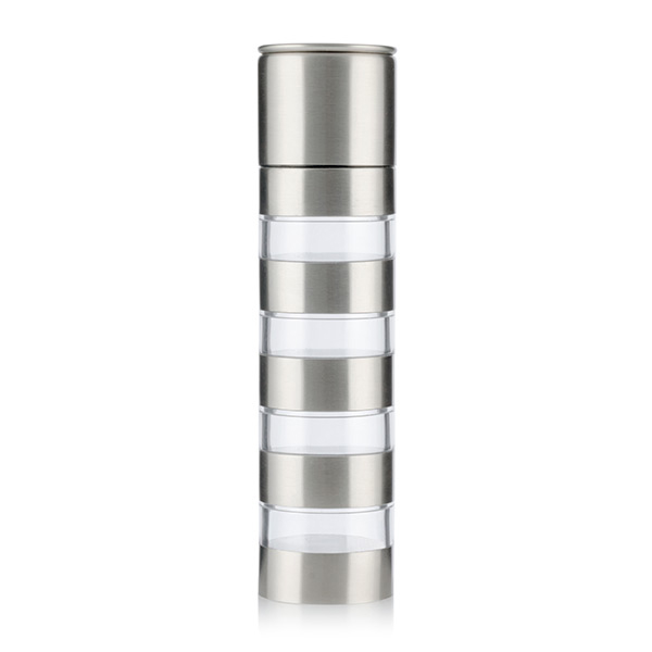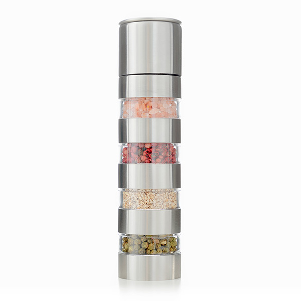 En originell keramisk kryddkvarn med fyra behållare för olika kryddor och en elegant högkvalitativ design med rostfritt stålbeläggning. Den har justerbar grovhet på malningen och en keramisk malningsskiva. Den används vanligtvis för att mala salt och peppar, men kan även användas med andra kryddor. Denna innovativa kvarn är det perfekta tillbehöret för de modernaste och mest utvalda köken.