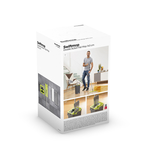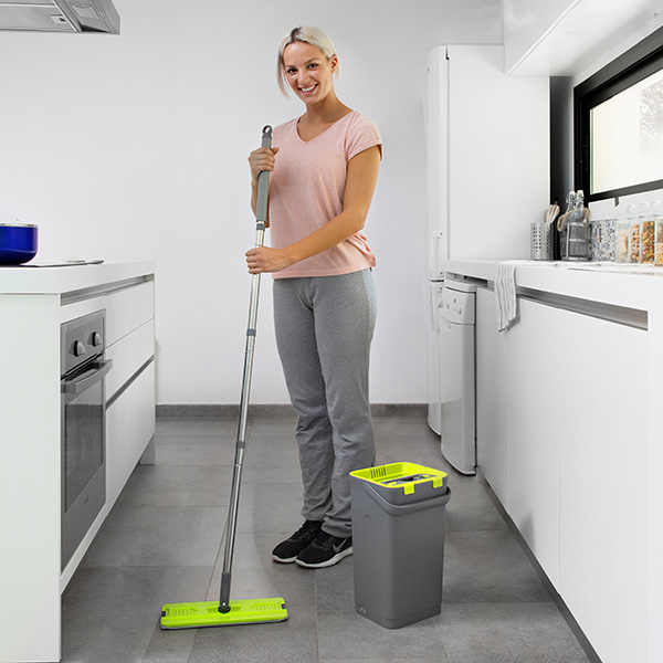 En komplett och original Double Action-mopp med en hink med dubbla fack (för att blöta och skölja) som är mycket lätt att använda och effektiv för djuprengöring. Den är utmärkt för alla typer av golv och ger perfekt resultat med minimal ansträngning. Med sin moderna design har den alla nödvändiga funktioner för att optimera städningen, lätt att komma åt i hörn och svåråtkomliga ställen och kan även användas upprätt.